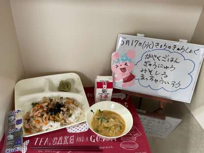 牛乳、かやくご飯、みそ汁、まっ茶ういろう です。