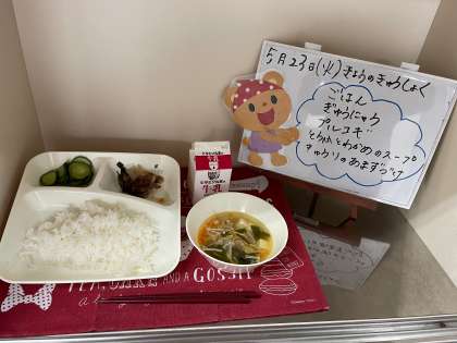 ごはん、牛乳、プルコギ、とうふとわかめのスープ、きゅうりの甘酢づけ です。