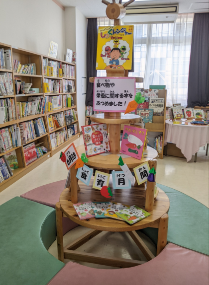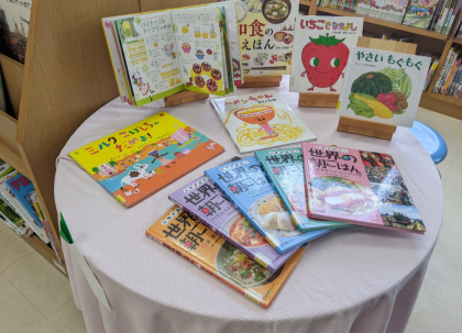 図書室では、食べ物や栄養に関する本を集めたコーナを作りました!