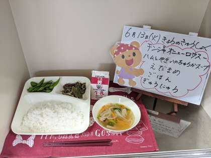 今日の給食は、ごはん、牛乳、チンジャオニューロウスー、ハムと野菜の中華スープ、えだまめです。