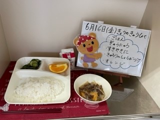 ごはん、牛乳、すき焼き煮、きゅうりのしょうがづけ、オレンジ でした。