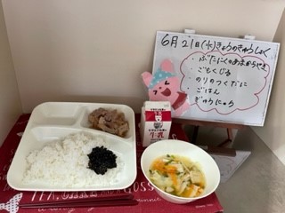 ごはん、牛乳、豚肉の甘辛焼き、五目汁、のりのつくだ煮 です。