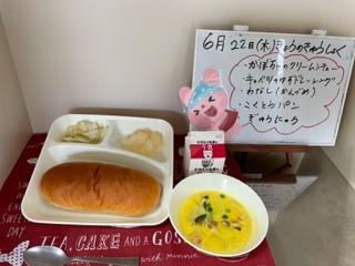 黒糖パン、牛乳、かぼちゃのクリームチュー、キャベツのゆずドレッシング、わなし(かんづめ) です。