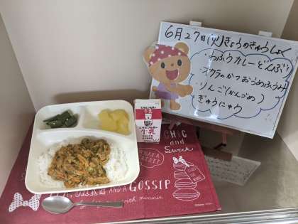 今日の給食は、和風カレー丼、牛乳、オクラのかつお梅風味、りんご(缶)です。