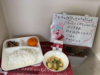 今日の給食は、ごはん、牛乳、鶏肉と野菜の煮もの、ひじき豆、みかん(冷凍)です。