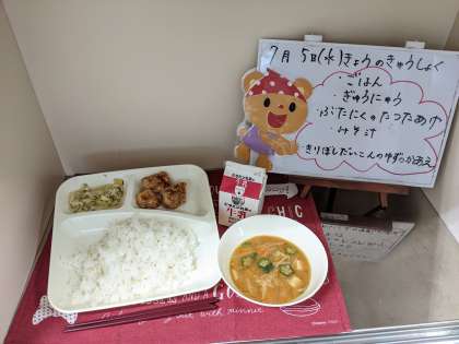 今日の給食は、ごはん、牛乳、豚肉のたつたあげ、みそ汁、切干しだいこんのゆずの香あえです。