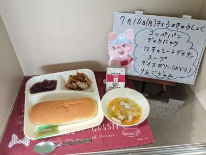 今日の給食は、コッペパン、牛乳、なすのミートグラタン、スープ、ダイスゼリー(ぶどう)、りんごジャムです。