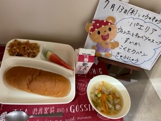 黒糖パン、牛乳、パエリア、ウインナーとキャベツのスープ、すいか です。