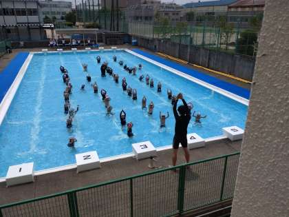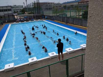 小学校のプールにも慣れてきました。ポニョの曲にのって、顔をつけたり水をか掛け合ったりして楽しく活動しています。