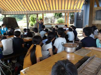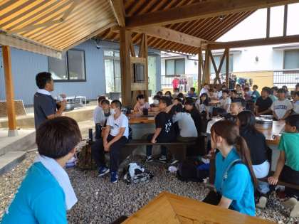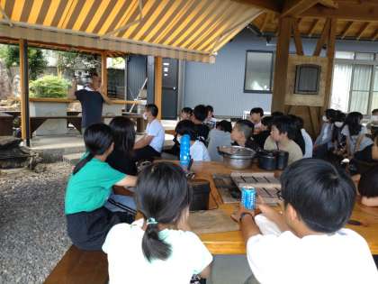 今から昼ごはんのカレーを作ります。ご飯も飯盒で炊きます。説明を聞いています。