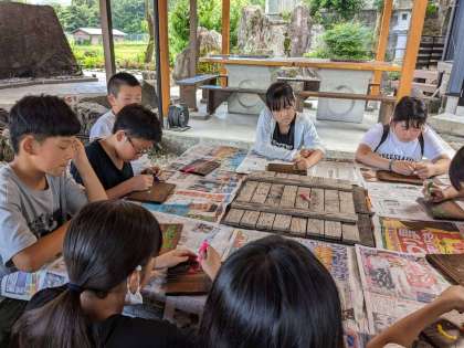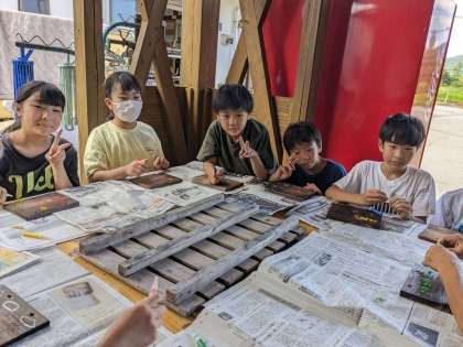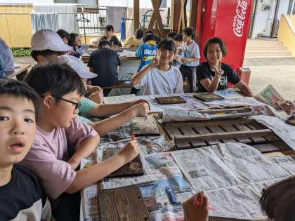 片付けが終わり、焼き板に絵付けを始めました。。
