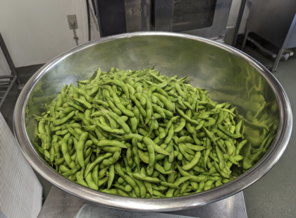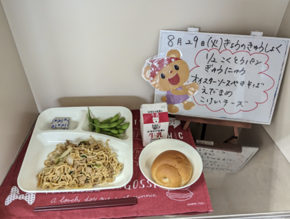 今日の給食は、1/2黒糖パン、牛乳、オイスターソース焼きそば、えだまめ、固形チーズです。