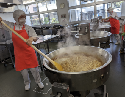 給食のオイスターソースは、かきに水あめやしょうゆ、さとう、塩などで味つけし、加熱してから作られています。