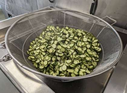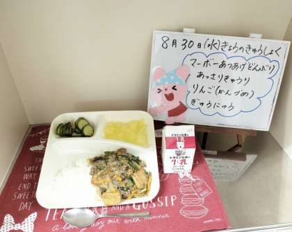 今日の給食は、マーボーあつあげ丼、牛乳、あっさりきゅうり、りんご(缶づめ)です。