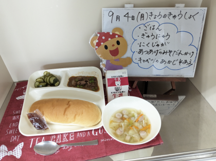 今日の給食は、コッペパン、牛乳、牛肉のデミグラスソース煮、スープ、きゅうりのピクルス、いちごジャムです。