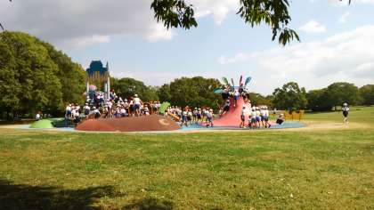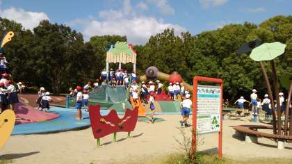 今日は、3・4年生が、遠足で万博記念公園に来ています。まずは、わくわく池の冒険ひろばで遊んでいま