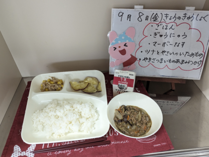 今日の給食は、ごはん、牛乳、マーボーなす、ツナと野菜のいためもの、焼きさつまいもの甘みつかけです。