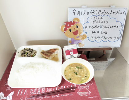 今日の給食は、ごはん、牛乳、あかうおのおろしじょうゆかけ、みそ汁、高野どうふのいり煮です。