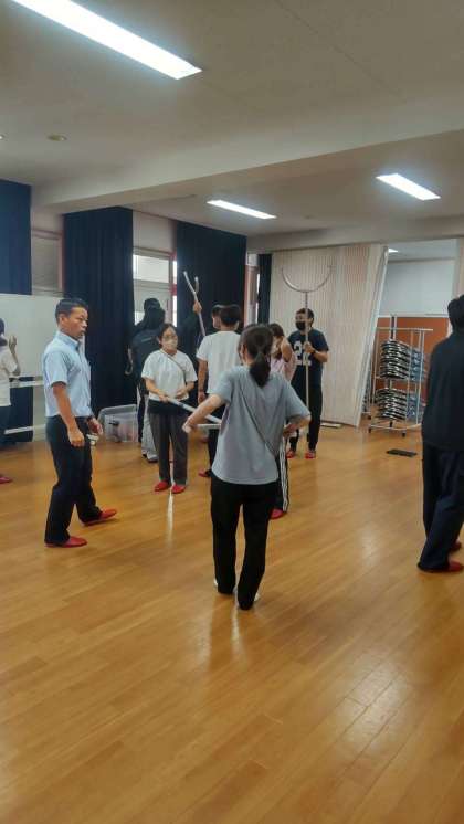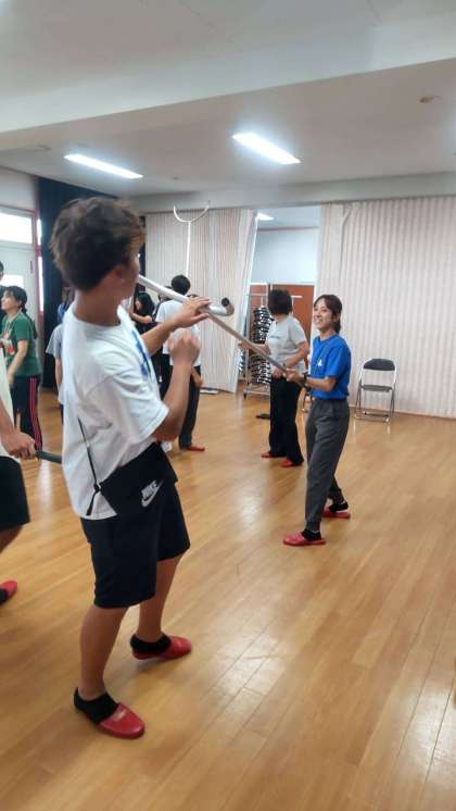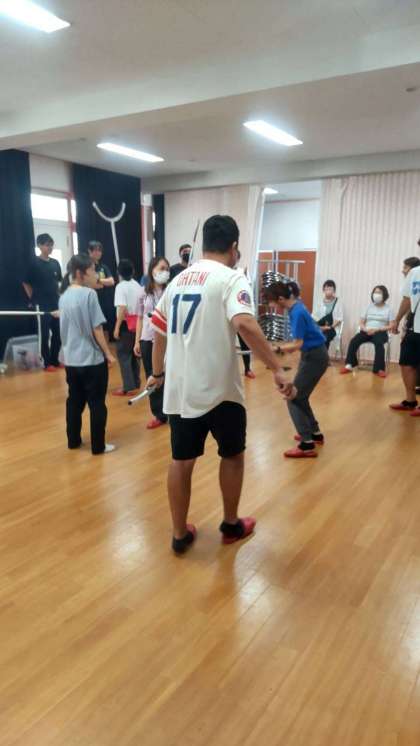 次に、警察の方が、刺股の使い方を実践してくださり、各自、習ったことを犯人役と先生役で練習しました。