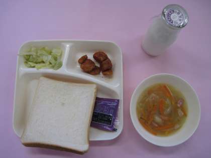 今日の献立は「まぐろのオーロラ煮、スープ、サワーキャベツ」でした。