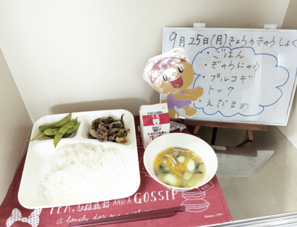 今日の給食は、ごはん、牛乳、プルコギ、トック、えだまめです。