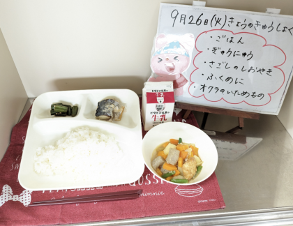 今日の給食は、ごはん、牛乳、さごしの塩焼き、含め煮、オクラのいためものです。