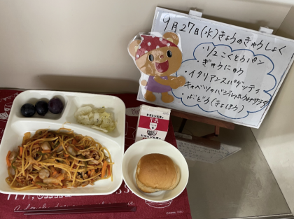 今日の給食は、1/2黒糖パン、牛乳、イタリアンスパゲッティ、キャベツのバジル風味サラダ、ぶどう(巨峰)です。