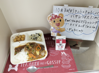 今日の給食は、ハヤシライス、牛乳、キャベツのひじきドレッシング、さくらんぼ(缶)です。