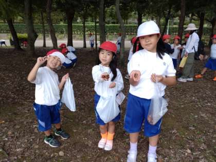 お弁当タイムが終わり、1年生はどんぐりを拾いに来ました。
