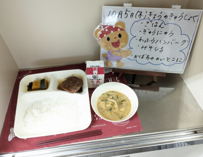 今日の給食は、ごはん、牛乳、和風ハンバーグ、みそ汁、かぼちゃのいとこ煮です。