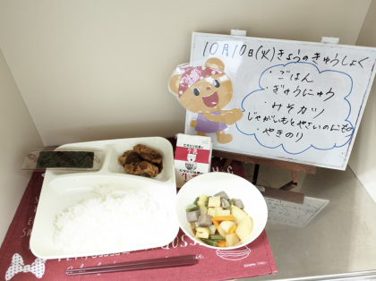 今日の給食は、ごはん、牛乳、みそカツ、じゃがいもと野菜の煮もの、焼きのりです。
