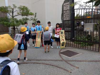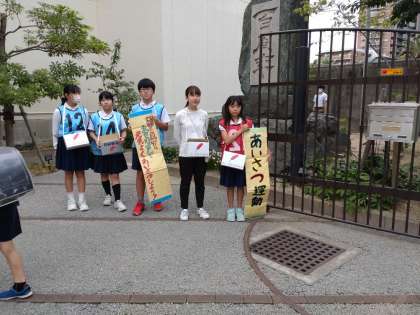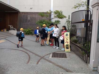今週はあいさつ週間です。赤いはねの募金活動も行っています。