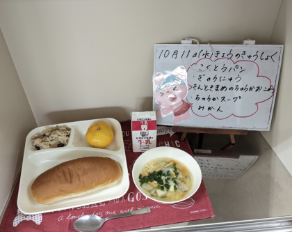 今日の給食は、黒糖パン、牛乳、金時豆の中華おこわ、中華スープ、みかんです。