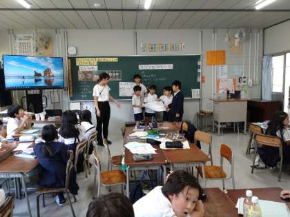 「総合的な学習の時間」の学習です。話し合ったことを発表し、意見を聞いています。