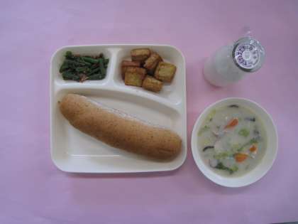 今日の献立は「はくさいのクリーム煮、あつあげのしょうがじょうゆかけ、牛肉と三度豆のごまいため」でした。