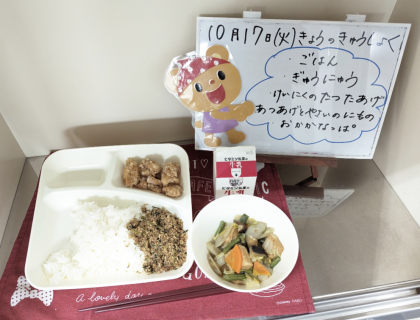 今日の給食は、ごはん、牛乳、鶏肉のたつたあげ、あつあげと野菜の煮もの、おかかなっ葉です。