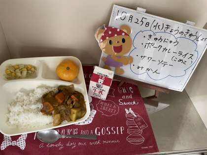 今日の給食は、ポークカレーライス(米粉)、牛乳、サワーソテー、みかんです。