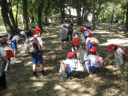 次にどんぐりひろいをしました。どんぐりだけでなく、いろんな木の実をみんなたくさん拾っていました。