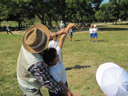お弁当を食べた後は、広場で遊びました。紙ひこうきを飛ばしているおじさんに紙ひこうきを飛ばさせてもらっている子もいました。