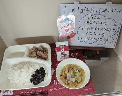 今日の給食は、ごはん、牛乳、豚肉のスタミナ焼き、すまし汁、のりのつくだ煮です。