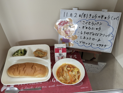 今日の給食は、黒糖パン、牛乳、白身魚フリッター、ミネストローネ、ブロッコリーのサラダです。