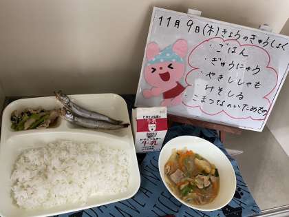 今日の給食は、ごはん、牛乳、焼きししゃも、みそ汁、こまつなのいためものです。