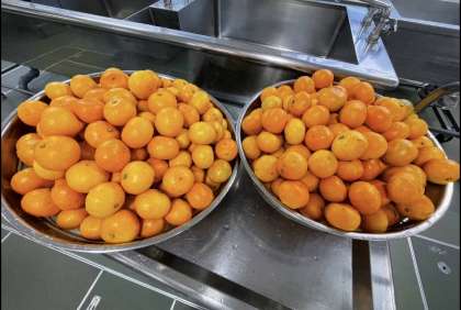 今日の給食は、黒糖パン、牛乳、豚肉と野菜のスープ煮、変わりピザ、みかんです。