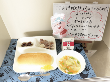 今日の給食は、コッペパン、牛乳、豚肉のバジル焼き、スープ、うずら豆のグラッセ、マーマレードです。