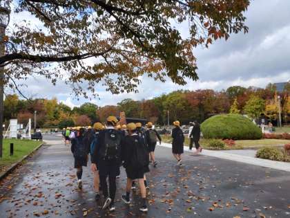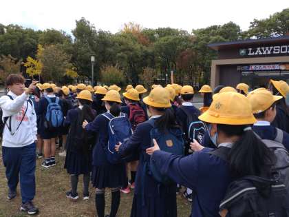 出発時、天候が良くなかったので、学校で早めにお弁当を食べて、大阪城公園まで来ました。