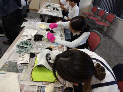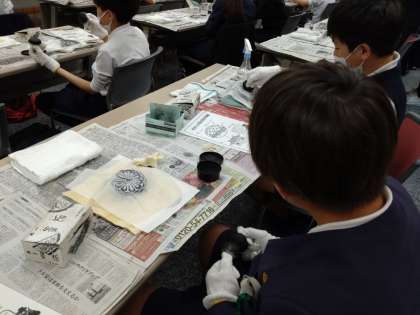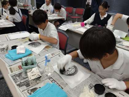 1組の、「むかしの瓦の拓本体験」の様子です。