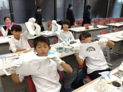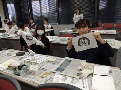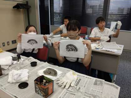 1組の、「むかしの瓦の拓本体験」の様子です。