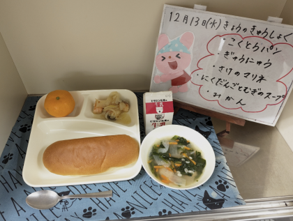 今日の給食は、黒糖パン、牛乳、さけのマリネ、肉だんごと麦のスープ、みかんです。