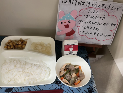 今日の給食は、ごはん、牛乳、鶏肉と野菜の煮もの、じゃこ豆、かぶのゆず風味です。