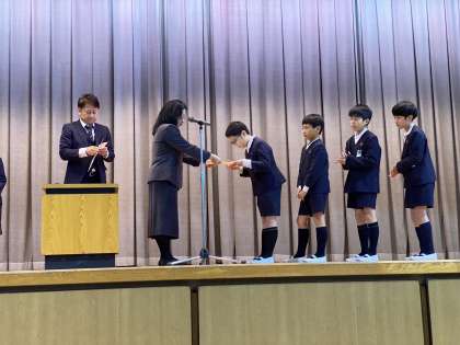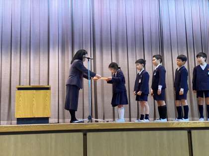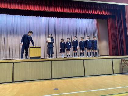 始業式に先立って、読書感想文に努力した児童の表彰をしました。